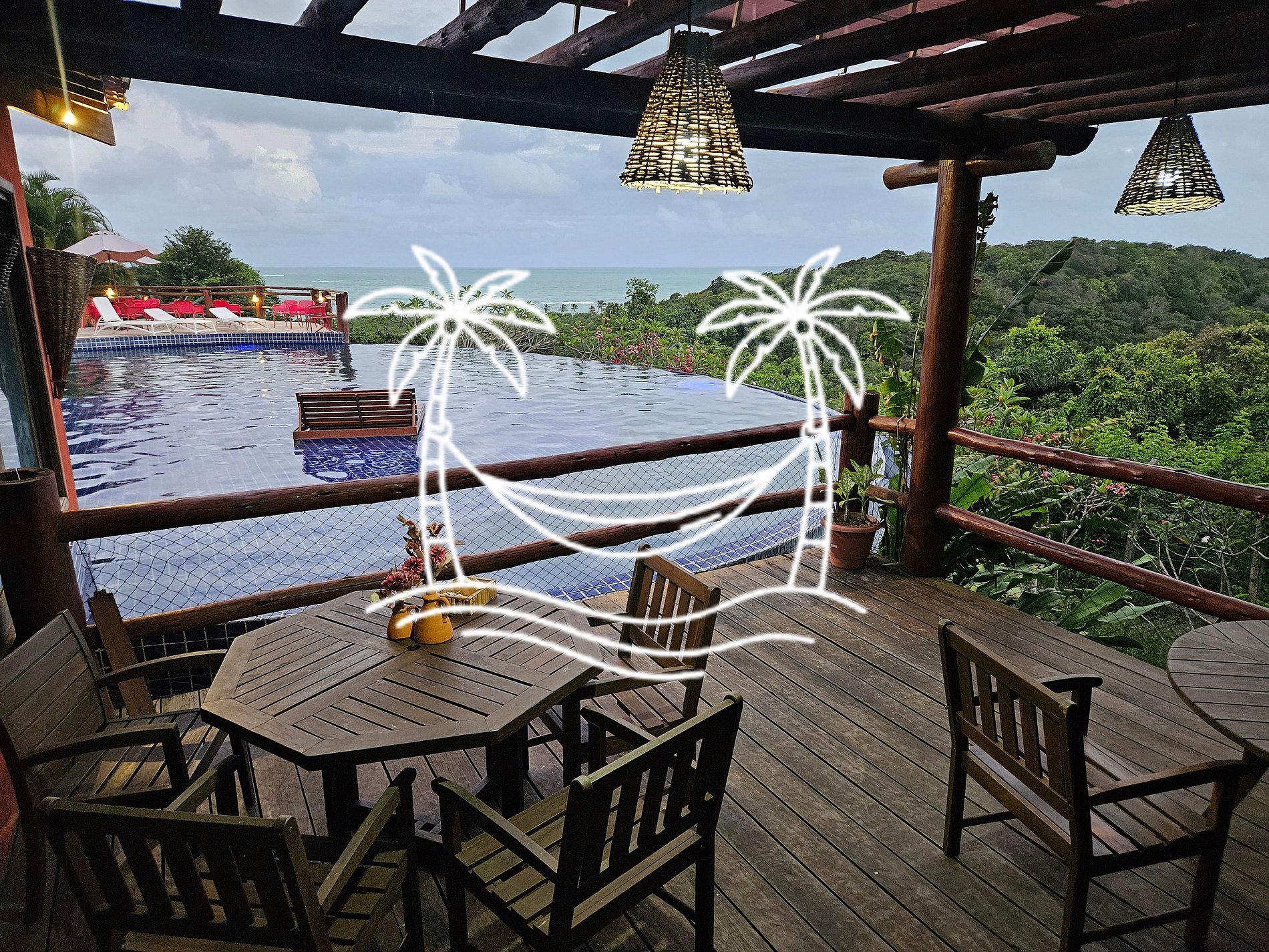 Sua experiência vai muito além do seu bangalô particular. Como nosso hóspede, você tem acesso livre à excelente estrutura de lazer do Villas do Pratagy. O coração das áreas comuns é a nossa espetacular piscina de borda infinita, um convite para relaxar enquanto admira a vista panorâmica para o mar da Praia do Pratagy. Perca-se em caminhadas pelos exuberantes jardins tropicais que cercam todo o condomínio, um verdadeiro refúgio de Mata Atlântica. Para as crianças, o parquinho infantil e a charmosa casinha da árvore são garantia de diversão segura. Para sua conveniência, um restaurante está localizado ao lado da piscina para refeições e drinks (consumo pago diretamente ao estabelecimento).