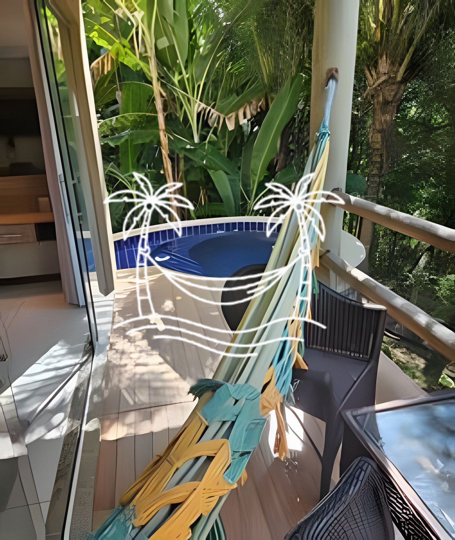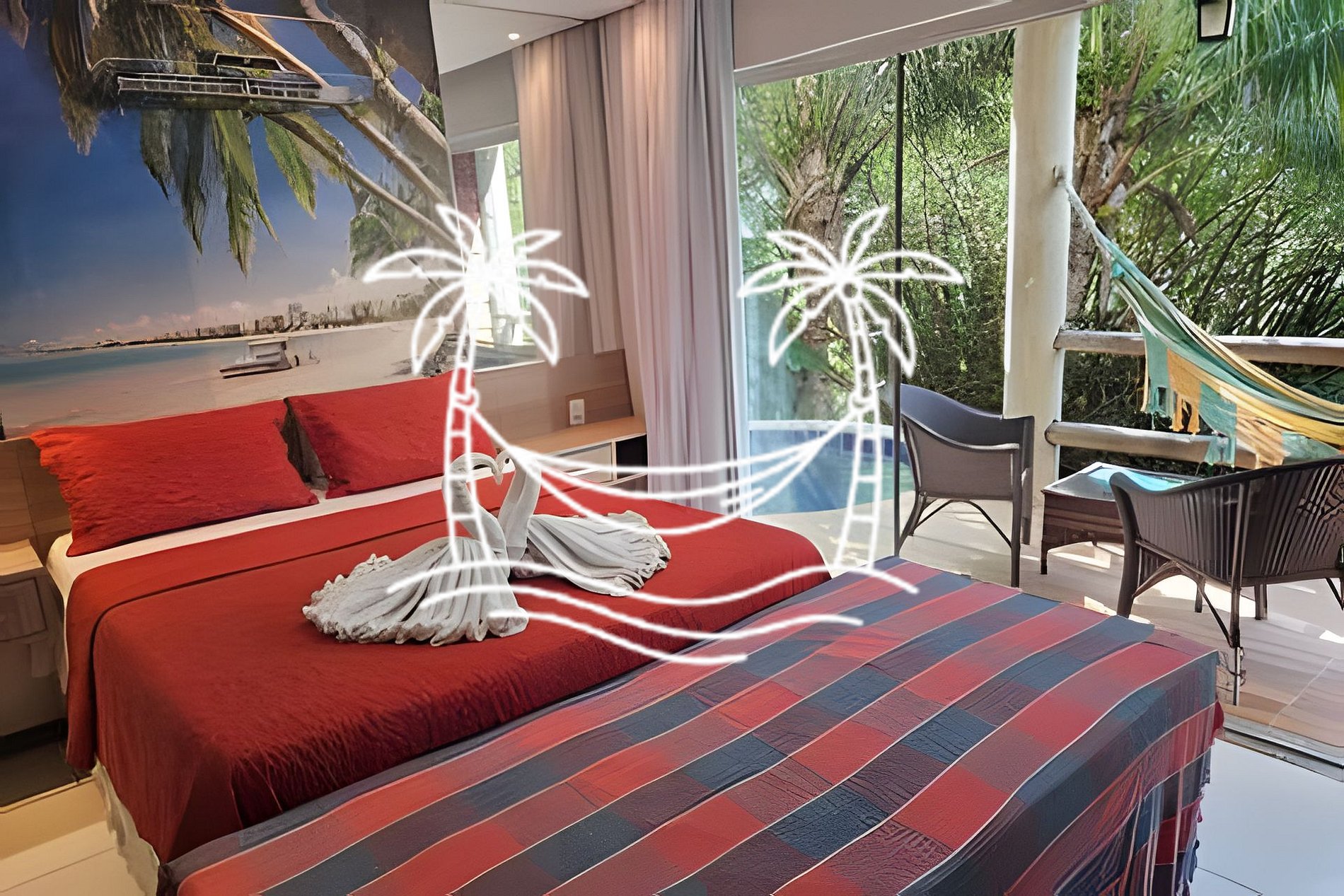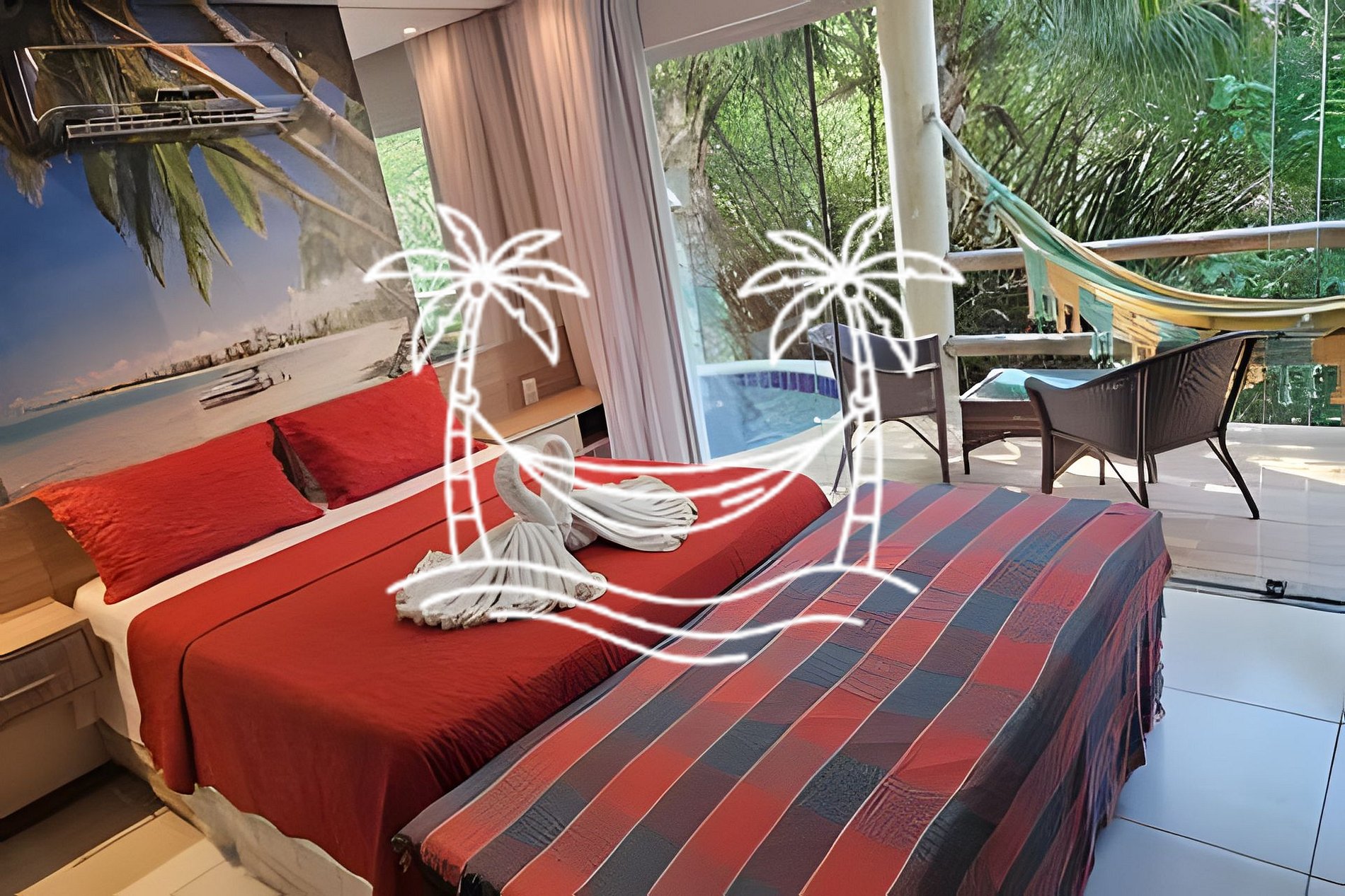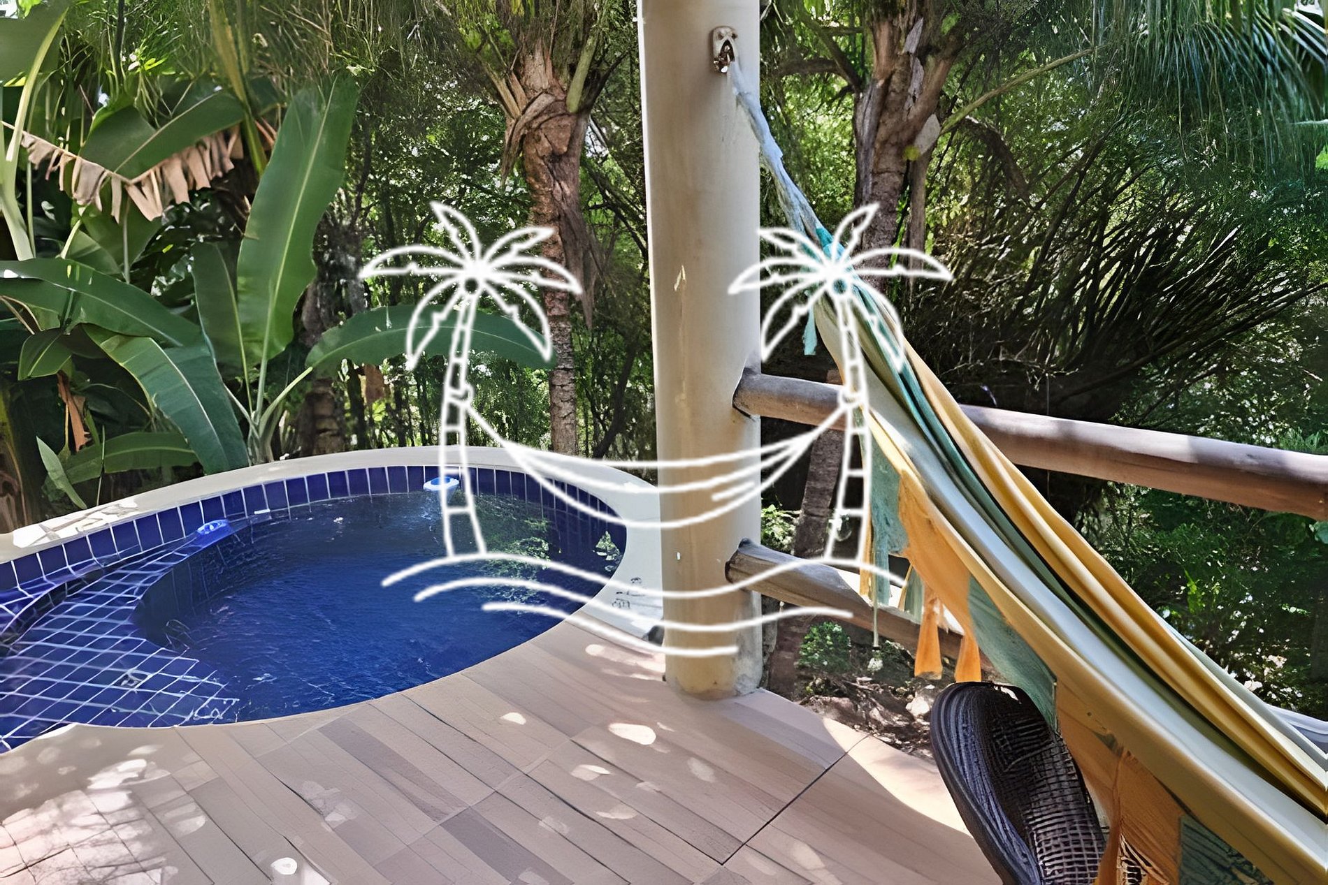 Com uma área privativa de 47 m², o Bangalô Super Luxo (Vime D1) foi projetado com uma planta inteligente de estúdio, otimizada para acomodar confortavelmente até 4 hóspedes em um único ambiente. No espaço, há uma confortável cama queen size e um sofá-cama. Para seu total conforto, o bangalô é climatizado e dispõe de Smart TV e Wi-Fi de alta velocidade. A cozinha é equipada com cooktop, micro-ondas, geladeira, sanduicheira, liquidificador e utensílios, garantindo a liberdade para preparar suas refeições favoritas. A área externa com a jacuzzi privativa aquecida é o ponto alto, um convite irrecusável para relaxar e aproveitar o ambiente.